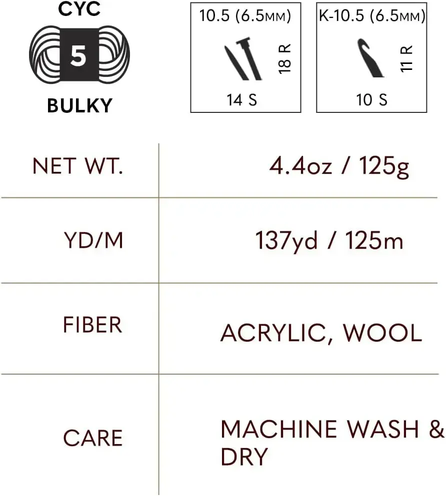 - Made with 80% acrylic and 20% wool fibers and rated CYC #5 Bulky, this yarn is a great addition to any yarn craft bag.