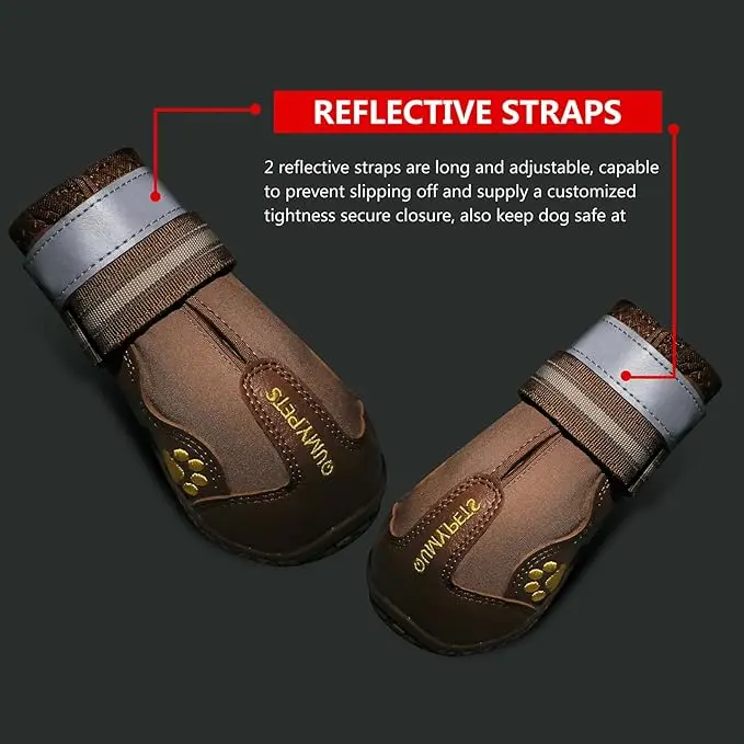 - SECURE and ADJUSTABLE: Easy to put on / off. These dog shoes expands with a wide split seam opening and two adjustable and reflective straps to ensure a tight fit, also make your dog safe at night.