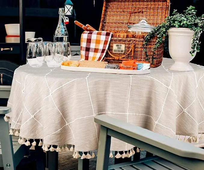 - Round Table cloth: This beige round cotton tablecloth is weaved with cotton fabric, making it easy for regular use. This plaid tablecloth is Round 63 inch. We have made the farmhouse round tablecloth that will perfectly suit a boho round tablecloth that can accommodate 4-5 people.