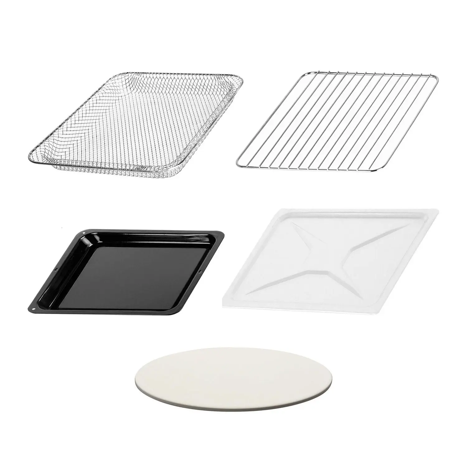 - COMPREHENSIVE ACCESSORIES: Comes equipped with an air frying basket, air rack, enameled baking/pizza tray, crumb tray, and a pizza stone