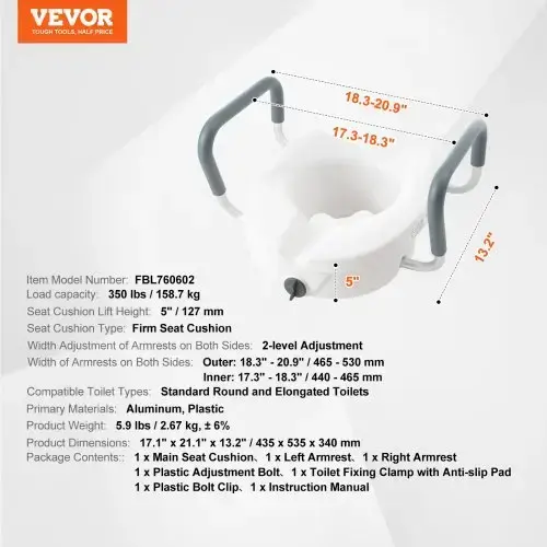 - Sturdy Materials and Construction: Constructed mainly from aluminum and high-strength plastic, the elevated toilet seat is durable and can support up to 350 lbs, ensuring individuals of different body shapes and weights can use it with confidence. It's also easy to clean throughout.