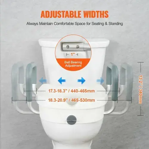 - 16.9" - 18.9" Inner Armrest Width: Considering comfort when sitting down, we offer adjustable armrests design, allowing for a more suitable distance between the armrests to accommodate diverse individuals and bathroom spaces.