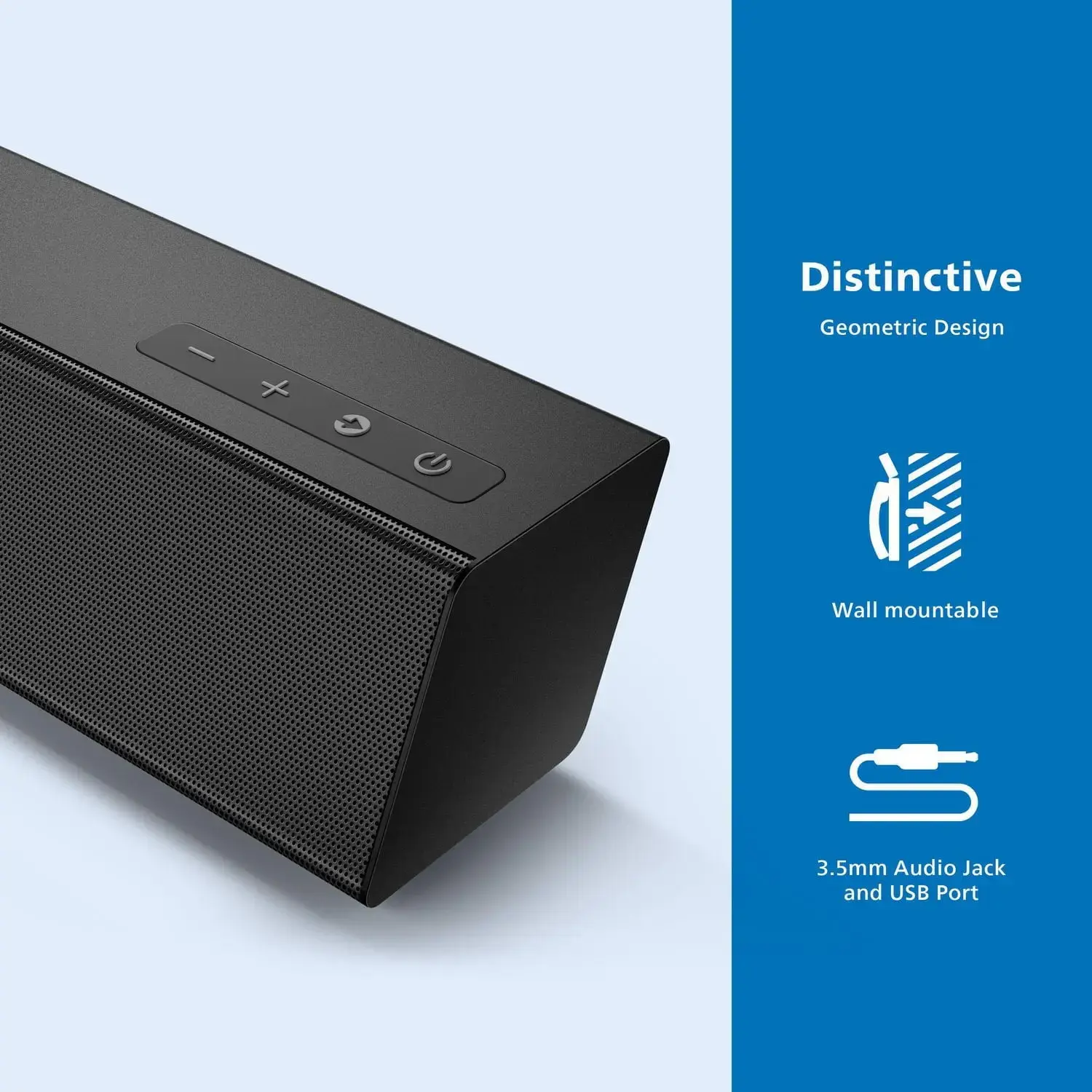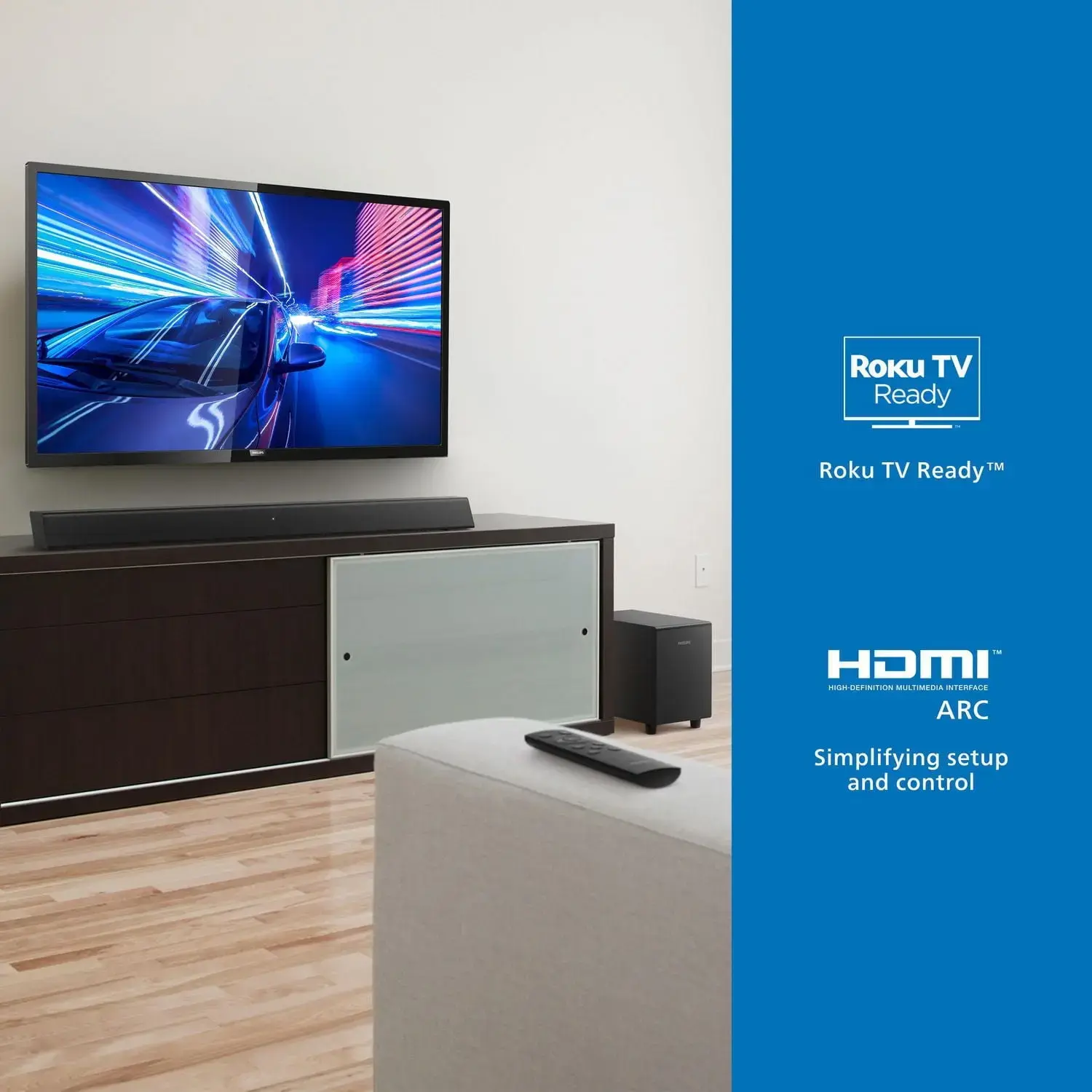 Welcome to better TV sound: Thundering explosions. Crystal clear dialogue. Philips TAB5306, a powerful soundbar with wireless subwoofer with total output of 140W, delivers exceptional performance while making it easy to control the volume using your TV remote. With 2.1 channels, every movie you watch and every soundtrack you love will sound clearer, deeper, closer. The ultra-modern trapezoid shape is designed to fit into any home setting. You can mount it on a wall with the included wall brackets, or slide it discreetly under the TV. The setup is also extremely simple, with HDMI ARC, audio-in and optical inputs. The Roku TV Ready badge means that this soundbar will work seamlessly with Roku TV, with easy access to sound settings and compatibility with your Roku remote.