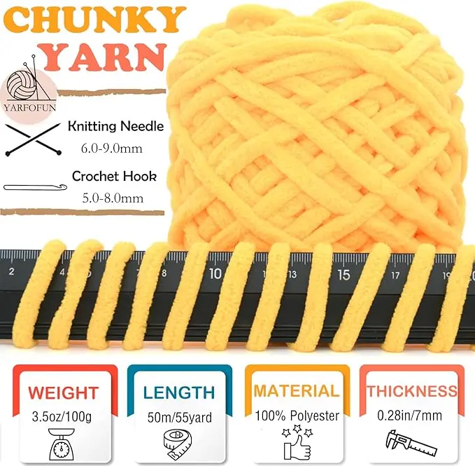 - 【Chunky Chenille Yarn Size】Each roll of our chunky velvet crochet yarn is about 100g/3.53 OZ in weight,50m/55 yards in length and 7 mm/0.28 inches in thickness.Recommended knitting needle size: 6-9mm and crochet hook size: 5-8mm.