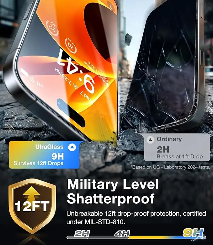 - 【Industry NO.1 Shatterproof】Authorized by International Military Standard with 12 rigorous engineering tests of 220lbs impact, 12ft drops, 25,000+ scratch tests, its strength, toughness and durability perform NO.1 among all glass.
