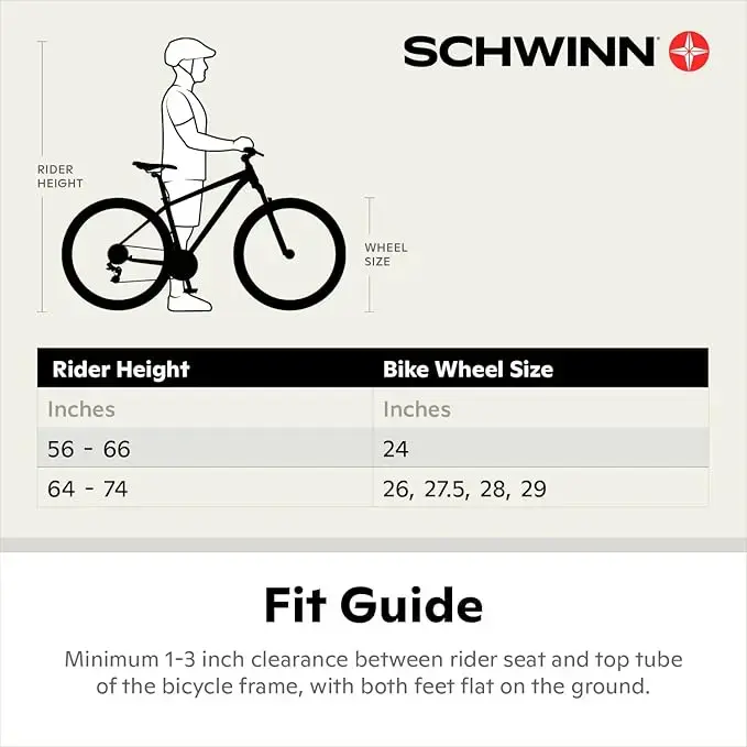 - Schwinn aluminum mountain frame with Schwinn suspension fork offer controlled riding. 24-inch wheels fit riders ages 8 and up, or 4'8" to 5'6" in height