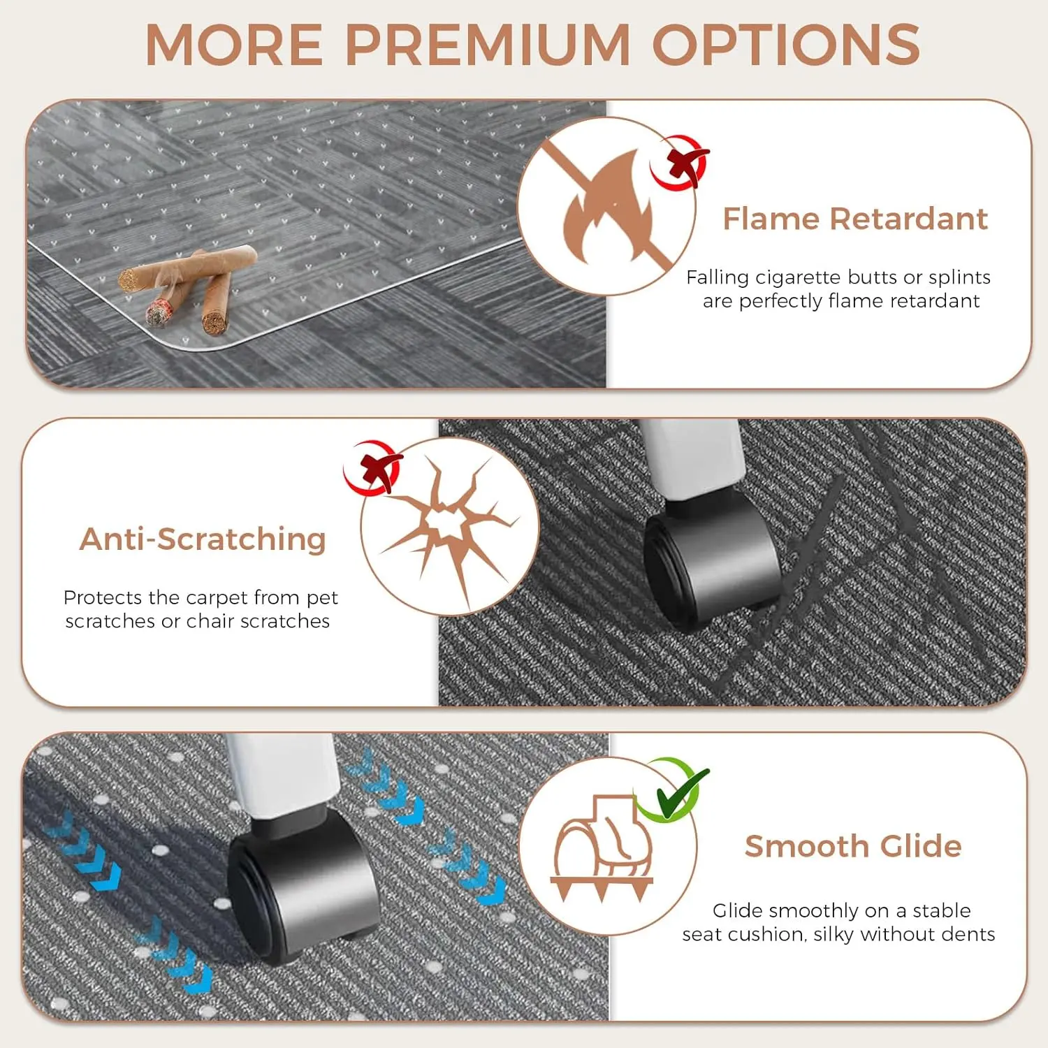 - SMOOTH SURFACE & EFFICIENT ANTI-SKID TEXTURE:The chair mat with a smooth easy glide surface provides added ease of movement with rolling desk chairs, proven to reduce leg fatigue by taking the strain off your legs. Also, studded provides complete stability and hold the floor mat firmly in place while in use to prevent mat from slipping.