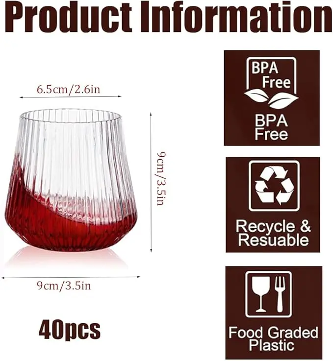 - 【Stemless Wine Glasses Bulk】:Each pack contains40 PCS plastic disposable wine glasses to accommodate small parties. Save time and energy with quality plastic clear plastic wine glasses so you can enjoy your event without worrying about the mess at the end of the party! Great for parties or individuals.