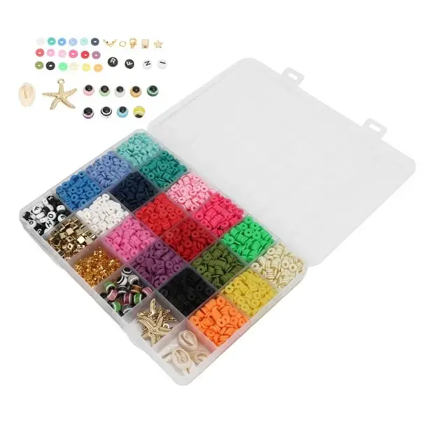 SpecificationItem Type: Polymer Clay BeadsMaterial: Soft Ceramic, PlasticPackage List1 x Storage Box3600 x Soft Pottery52 x Letter50 x Golden Jump Ring20 x Golden Lobster Clasp50 x Golden Tetragonum Beads50 x Pentagram Beads50 x Gold Buckle5 x Starfish Pendant5 x Shell25 x Eyes1 Roll 0.8mm Elastic Thread 10mNote