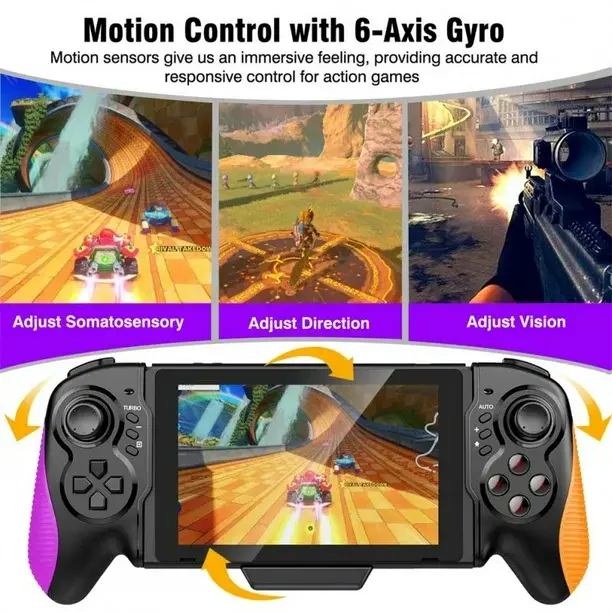 Wired Handheld Controller: This controller is compatible for Switch, has a large grip to prevent the console from slipping off. Wired connection, no latency, provides a more stable gaming experience. Compatible for Switch/Switch OLED: The controller handle is designed compatible for Switch/Switch OLED game consoles and uses Type-C connection to achieve plug and play, providing better performance without signal delay. PD Playback Fast Charging: Built-in intelligent PD fast charging chip, can simultaneously charge game console during game (If you need to charge while playing, please use the original power adapter). 6-axial Gryo Motion Control: The controller is equipped with a sensitive 6-axial gyroscope for excellent direction control in sports games, and coupled with a dual vibration motor with timely vibration feedback. Ergonomic Controller Grip: The grip surface of the controller is made of sweat and slip resistant quality materials, and the upgraded controller grip brings more comfort and better performance for all game fans. .Description:Name: Game Controller;Color: blue-red, dark green;Motor: double motor vibration;Gyroscope: 6-axial gyroscope;Interface Type: type-c;Product material: ABS;Product size: 31x6.5x12.7CM;Product weight: 410g;Packing list:1 x game controller1 x instruction manual1 x packing box
