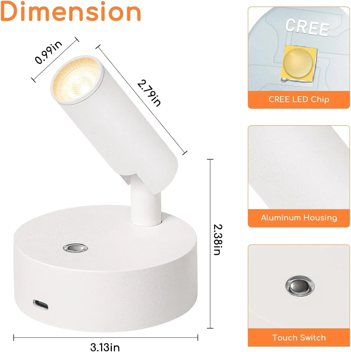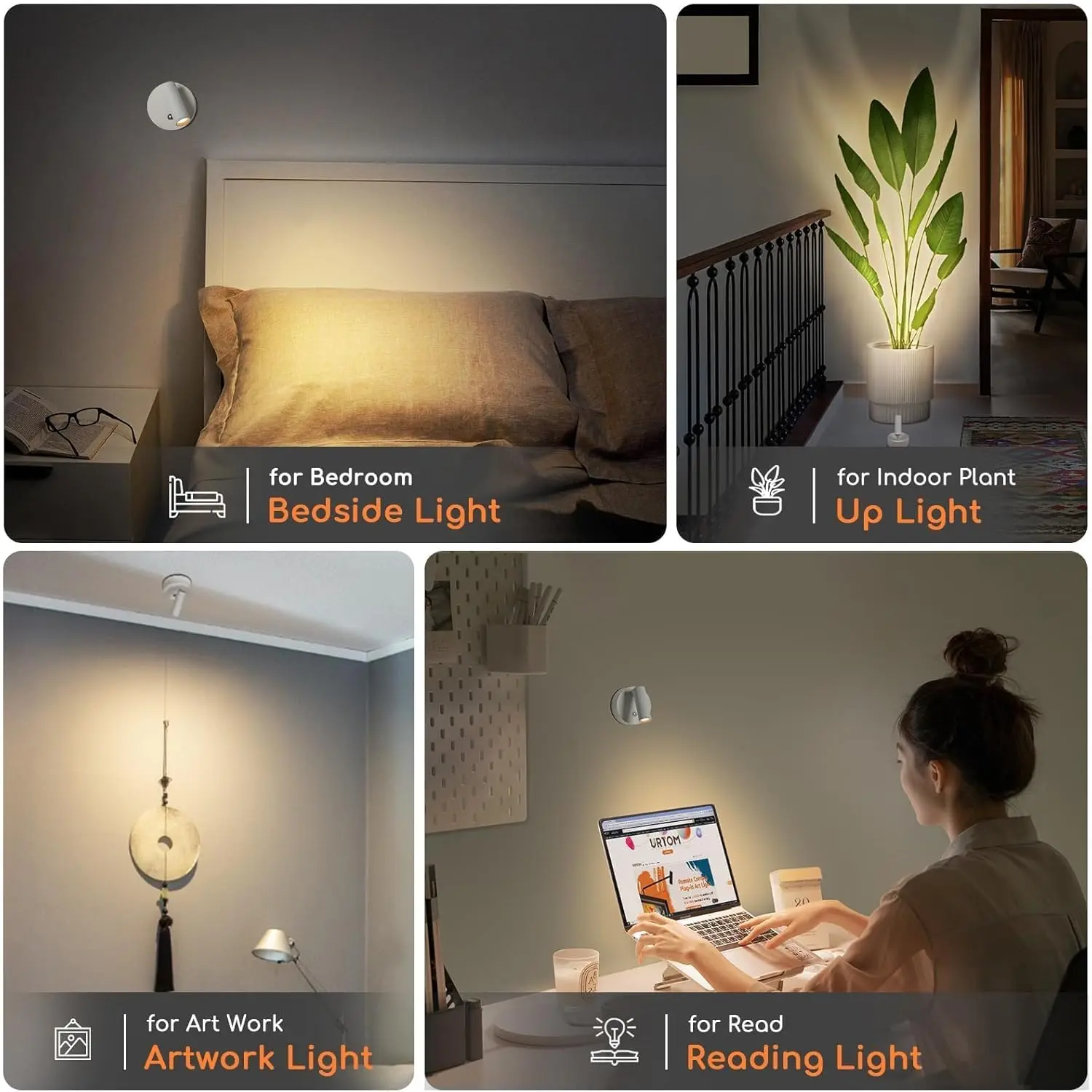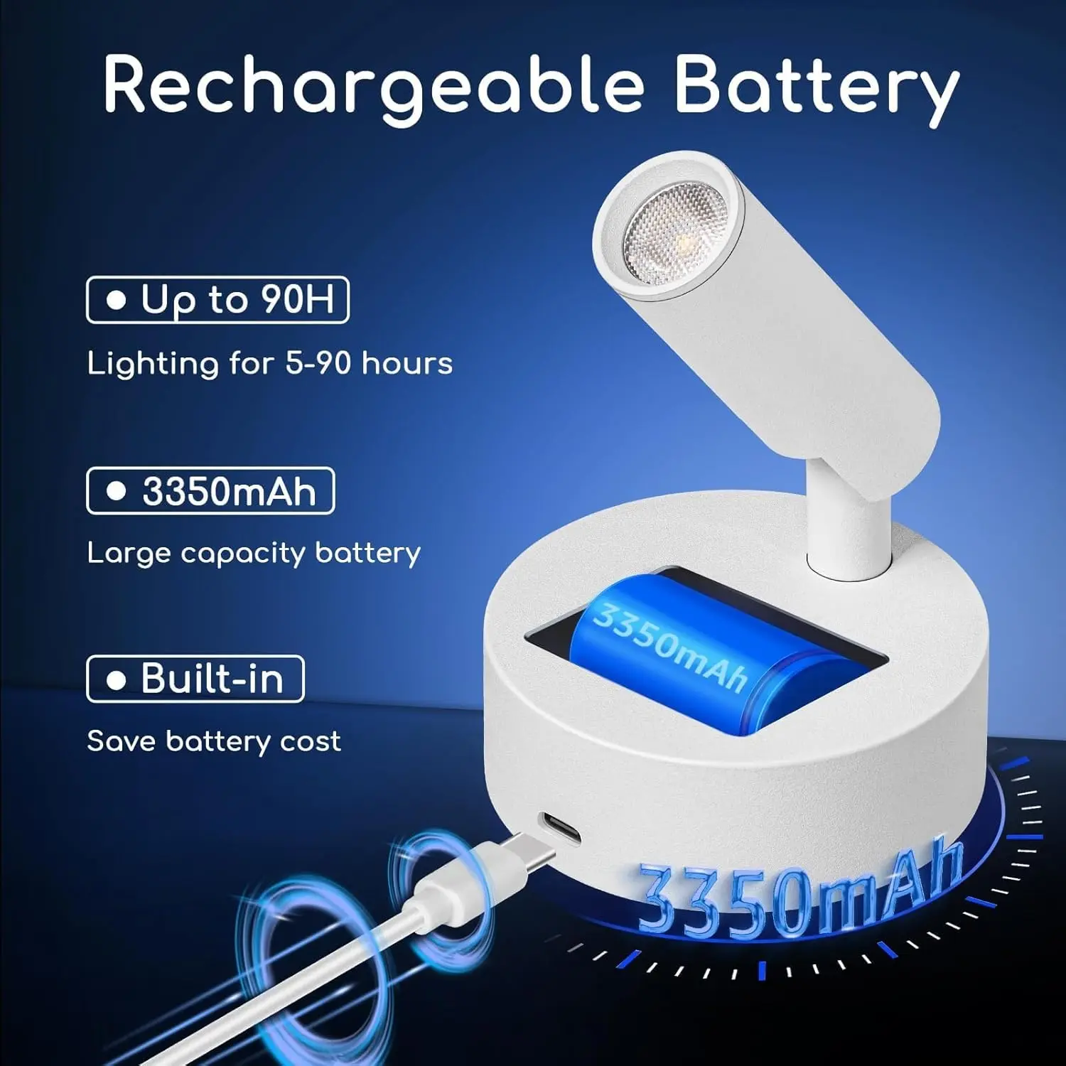 Wireless and rechargeable: URTOM battery indoor spotlight has a built-in 3350mAh rechargeable battery. No wiring or plug needed, easy to place anywhere. This large-capacity wireless spot lasts 5 hours at the highest brightness and 80 hours at the lowest brightness. Comes with 0.5m USB-C charging cable.