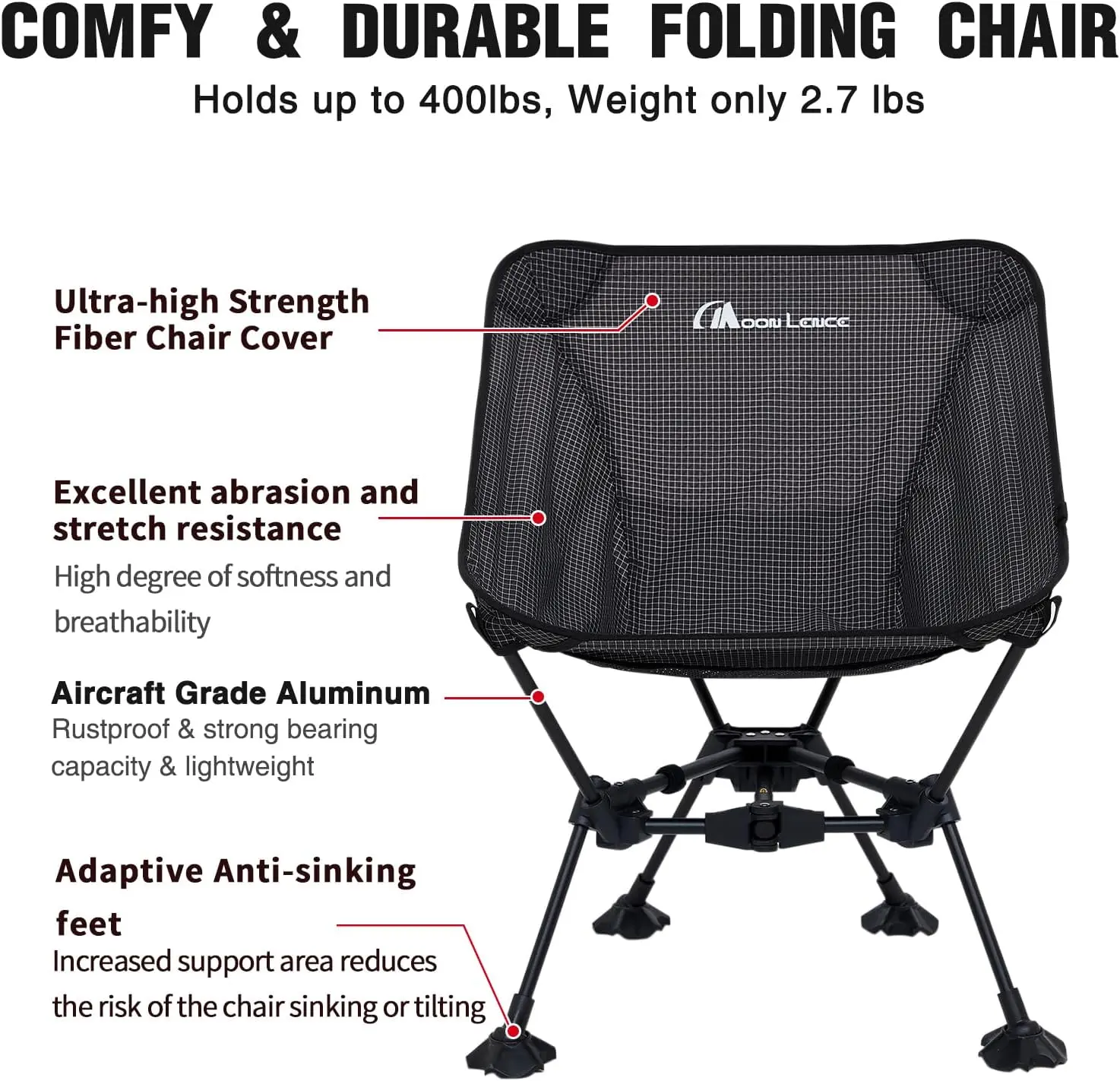 - The FOURTH generation chair of Moon Lence: Built for ultimate stability with a solid triangular structure and central linkage pole forming a dual-triangle base, combined with aircraft-grade aluminum for a super rigid body.