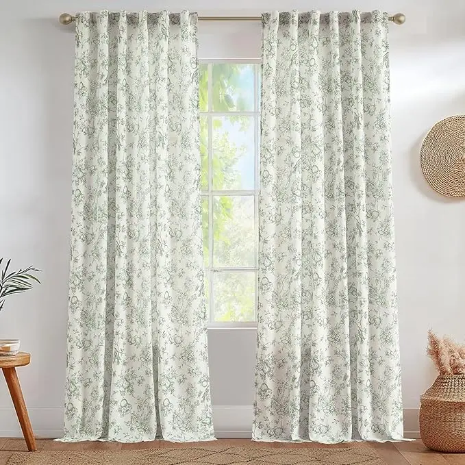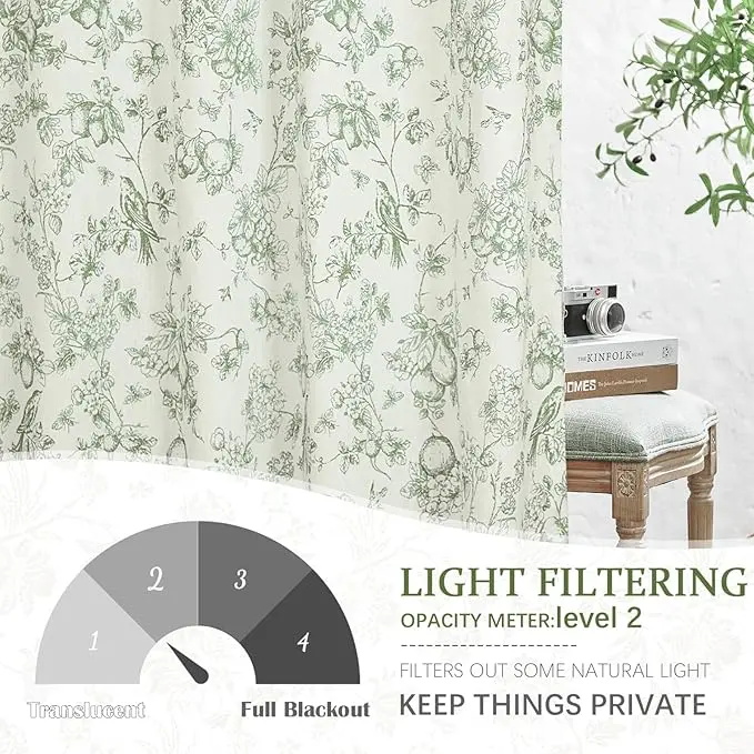 JIN CHAN Linen Blend Floral Curtains for Living Room 96 Inches Long Sage Green Drapes Back Tab Light Filtering Toile Bird Printed Farmhouse Bedroom Decor Rod Pocket Window Treatments 2 Panels Set