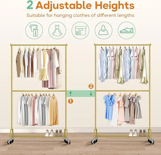 【Adjustable Height】:Middle Rod height is adjustable, lower bar ensures the clothes hung on the upper and lower bars do not obstruct each other, closet rack is total 77" from the top to the rack base (not to the wheels), taller clohting rack for hanging clothes is perfect for pants, sweaters and shirts;