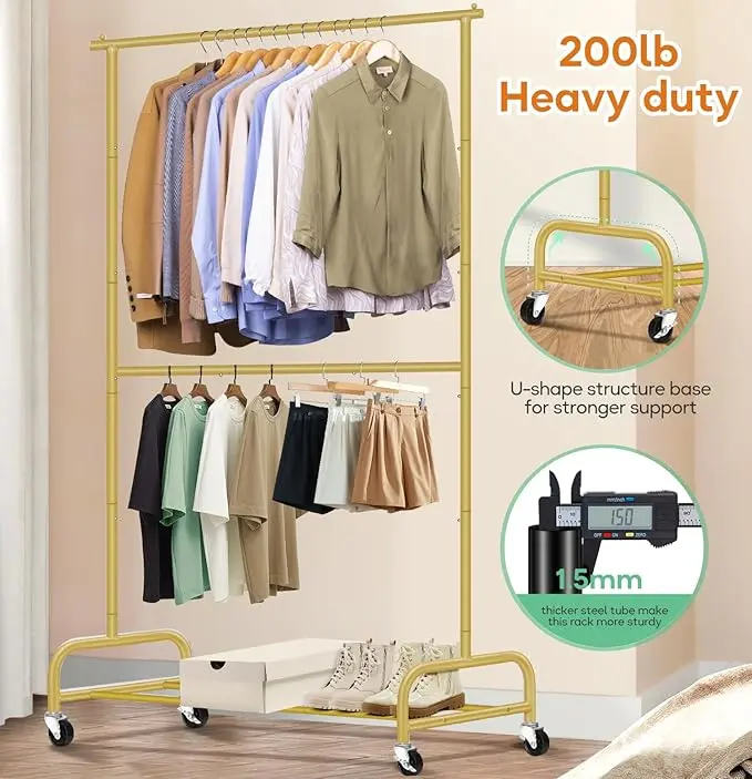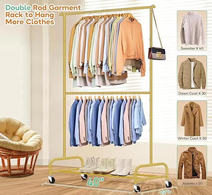 SLEEPING LAMB Double Rod Heavy Duty Clothes Racks for Hanging Clothes Rack, Metal Rolling Garment Rack With Wheels Clothes Hanger Rack Wardrobe Rack for Coats, Shirts (Gold)
