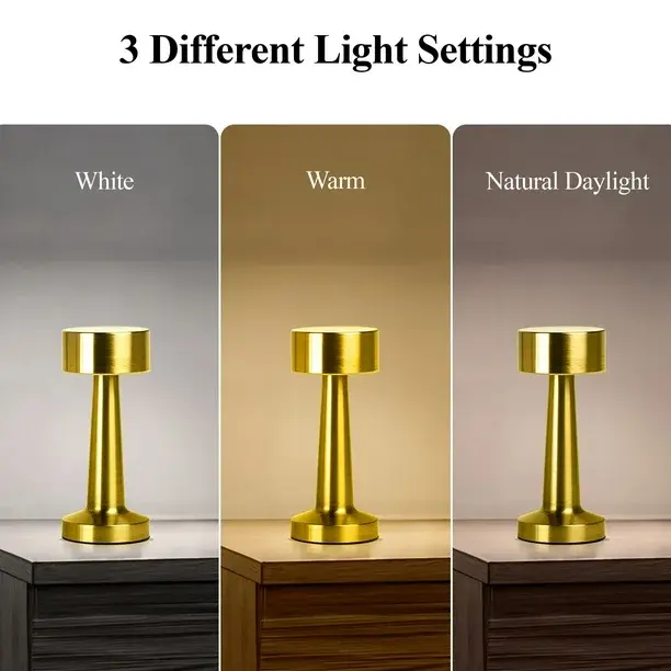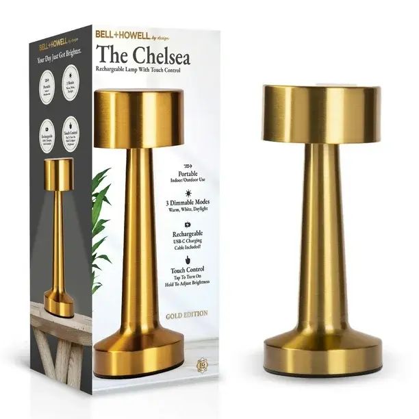 Enhance any space with the Bell + Howell Chelsea Table Lamp in gold. This cordless LED lamp features touch control with three lighting modes: warm, white, and daylight, allowing you to set the perfect mood for any activity. Compact at 8.4 inches tall, it’s ideal for bedside tables, desks, or outdoor dining. The rechargeable battery provides 5–6 hours of continuous light and recharges in just 3–4 hours. Lightweight and portable, the Chelsea Lamp blends style, convenience, and versatility for every setting.