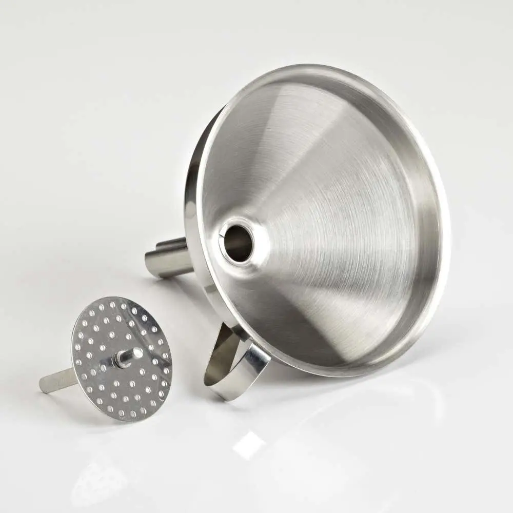 The Stelo Funnel and its strainer make it a useful tool for any kitchen. Solid stainless steel funnel includes a stainless steel strainer. Dishwasher safe.