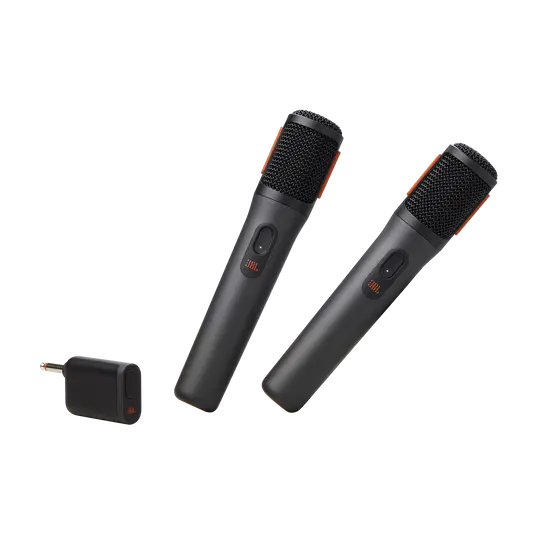 Make your good times even better with JBL PartyBox Wireless Mics. Just plug them into any JBL PartyBox, or use the dongle for the freedom of a wireless connection, and let your voice be heard. Indoors or outside, you'll sound clear and captivating on these mics specially tailored to sound amazing over any PartyBox speaker. A built-in foam pop filter minimizes any extraneous vocal sounds as you sing a duet with your best friend, and a shock mount system keeps things quiet when you're passing the mic to someone else. Up to 20 hours of play time and because you can still use a mic even while it's charging on the PartyBox's built-in power bank, the fun will last as long as the party does. Rock the house with the JBL PartyBox Wireless Mic.