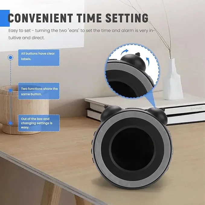 - EASY TO SETUP - Turning the two "ears" to set the time and alarm is extremely intuitive and straightforward. With all buttons clearly labeled and almost no two functions sharing the same button, it is a breeze to use right out of and change settings.