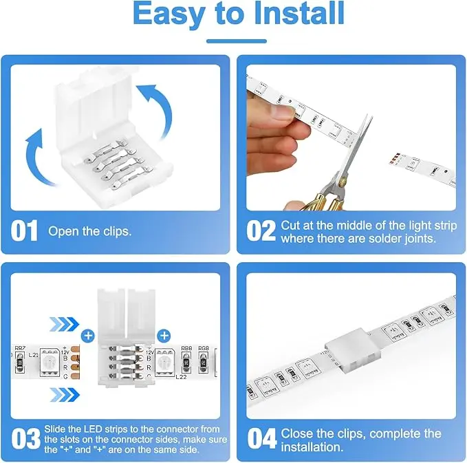 - Easy to Use: No soldering required, simply slide the light strip under the metal pins of the connector, align the "+" sides, snap the clip, and achieve an ultra-strong stable connection