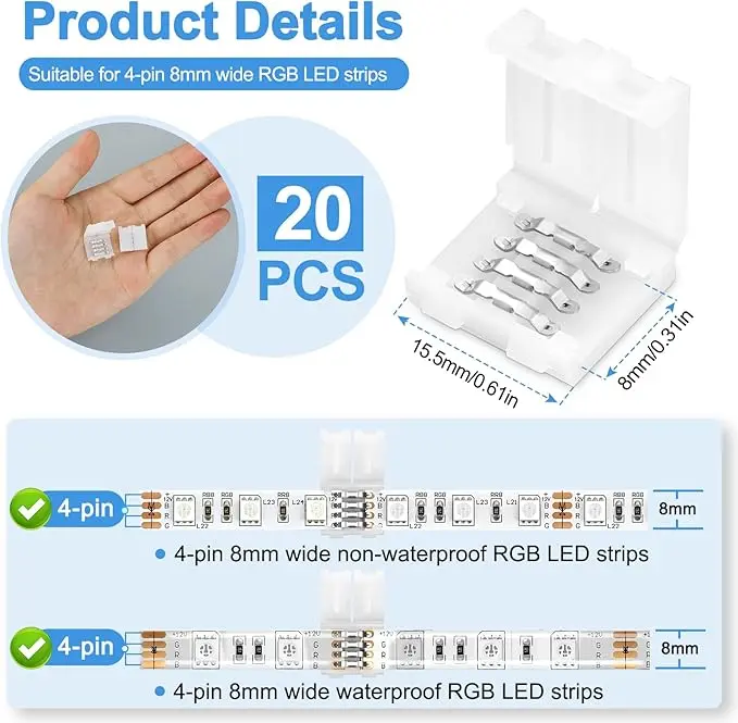 - Wide Compatibility: These LED light strip connectors are suitable for 4 pin 8mm (0.31in) wide SMD 2835/3528/5050 RGB LED flexible light strips, whether they are waterproof or non-waterproof
