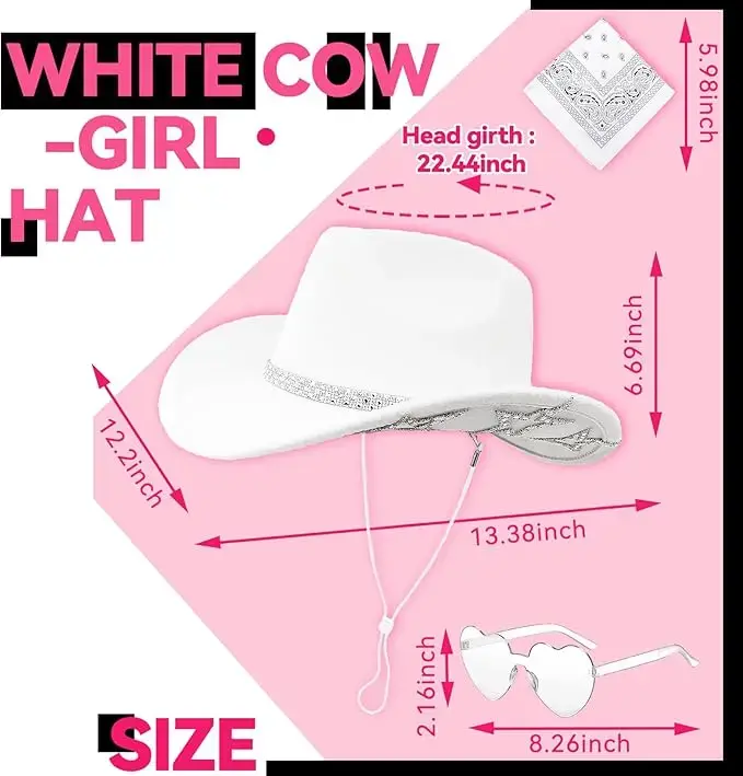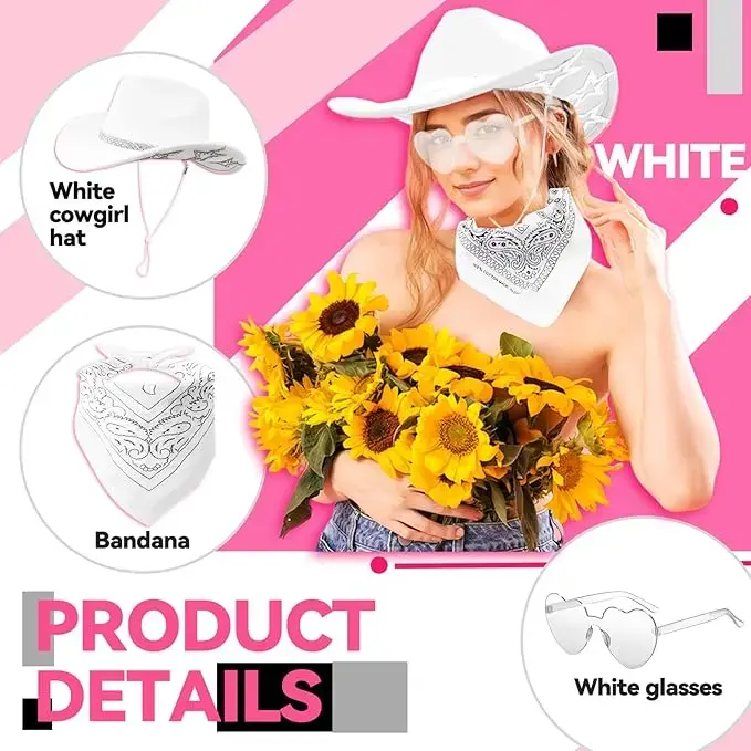 Star Cowgirl Set: Includes 1 white felt cowboy hat(Not a cheaply made one time use hat), 1 pair of heart sunglasses, and 1 bandana, perfect for adding a stylish and personalized touch to your cowgirl outfit.