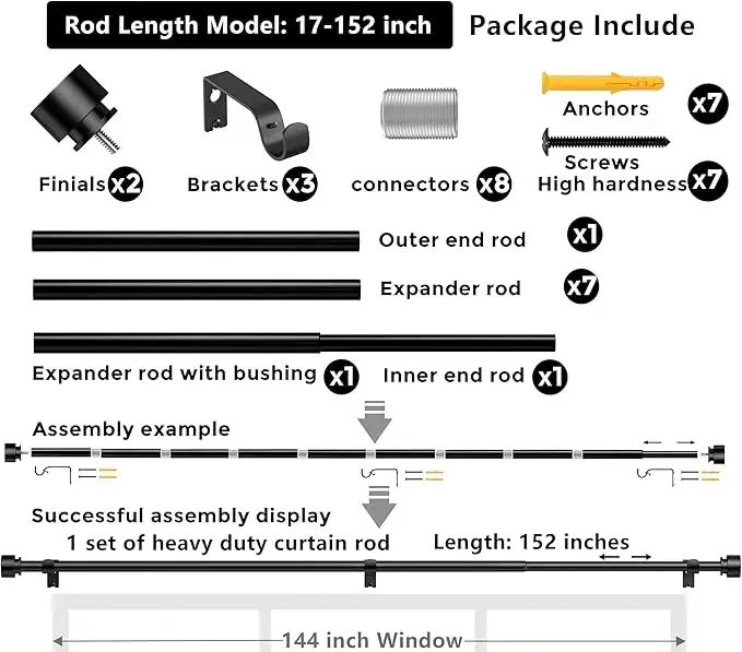 - Customizable Length: Crafted with a 0.7mm thickness, this curtain rod offers versatile length adjustments, ranging from 17 to 152 inches, suitable for 17 to 148 inches window. It includes 10 sectional rods that are designed to be assembled by screwing together, ensuring a seamless and sturdy fit. The length of the curtain rod can be adjusted and locked at the ideal length.