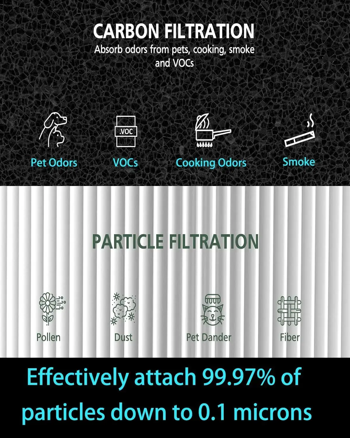 Our 311i + Max filter replacement made of H13 true HEPA air filter and a high-efficiency activated carbon filter for good clean filtration and performance. It's can attach most airborne particles, like dust, pet dander, pollen, household odors from smoking, cooking and pets.
