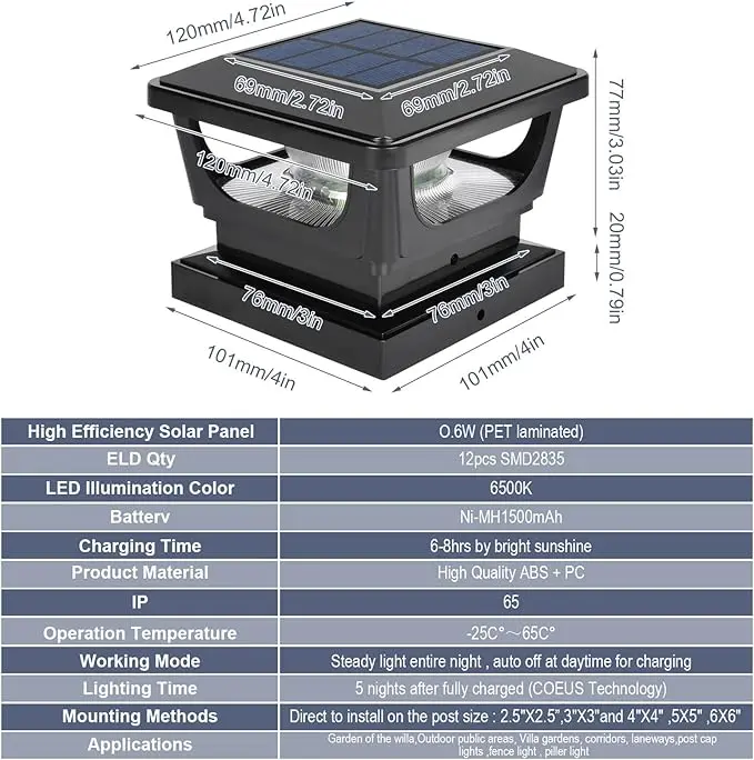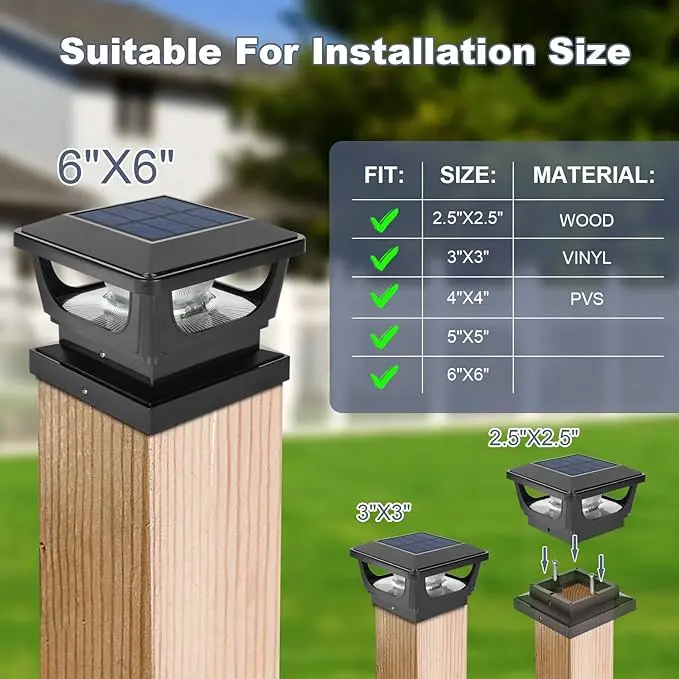 - 【Modern Solar Post Lights】Each of our solar fence post light comes with a base, suits for 3”x3” and 4”x4” wooden posts. Solar powered outdoor fence post lights without complicated wiring, making them perfect for garden and patio decoration.