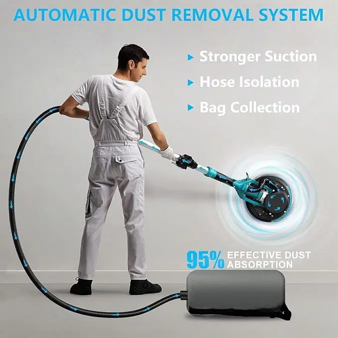 - Integrated Auto Dust Removal System - Our drywall sander with vacuum attachment dust collector with a built-in suction unit that has powerful suction and is transported through a flexible hose to a dust collection bag. Absorbs up to 95% of dust particles, ensuring a safe and clean working environment while minimizing cleanup