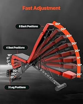 - Adjustable and Multi-purpose: The adjustable strength training bench is designed with 8 back positions, 4 seat positions, and 3 footrest positions. Simply pull the quick-release bolts to adjust the position that suits you, and it will automatically lock into place. This full-range adjustment allows you to target and work all muscle groups during your workout