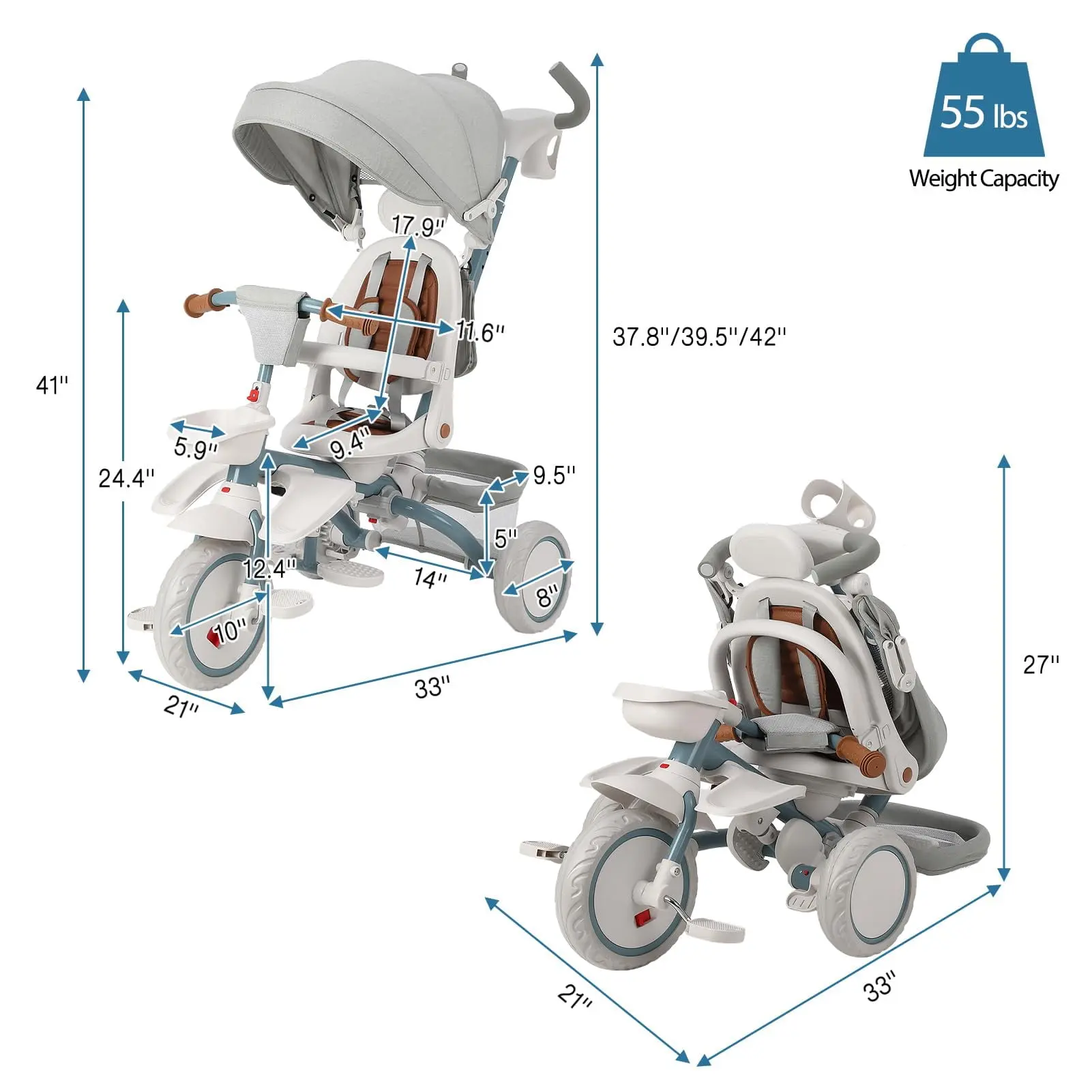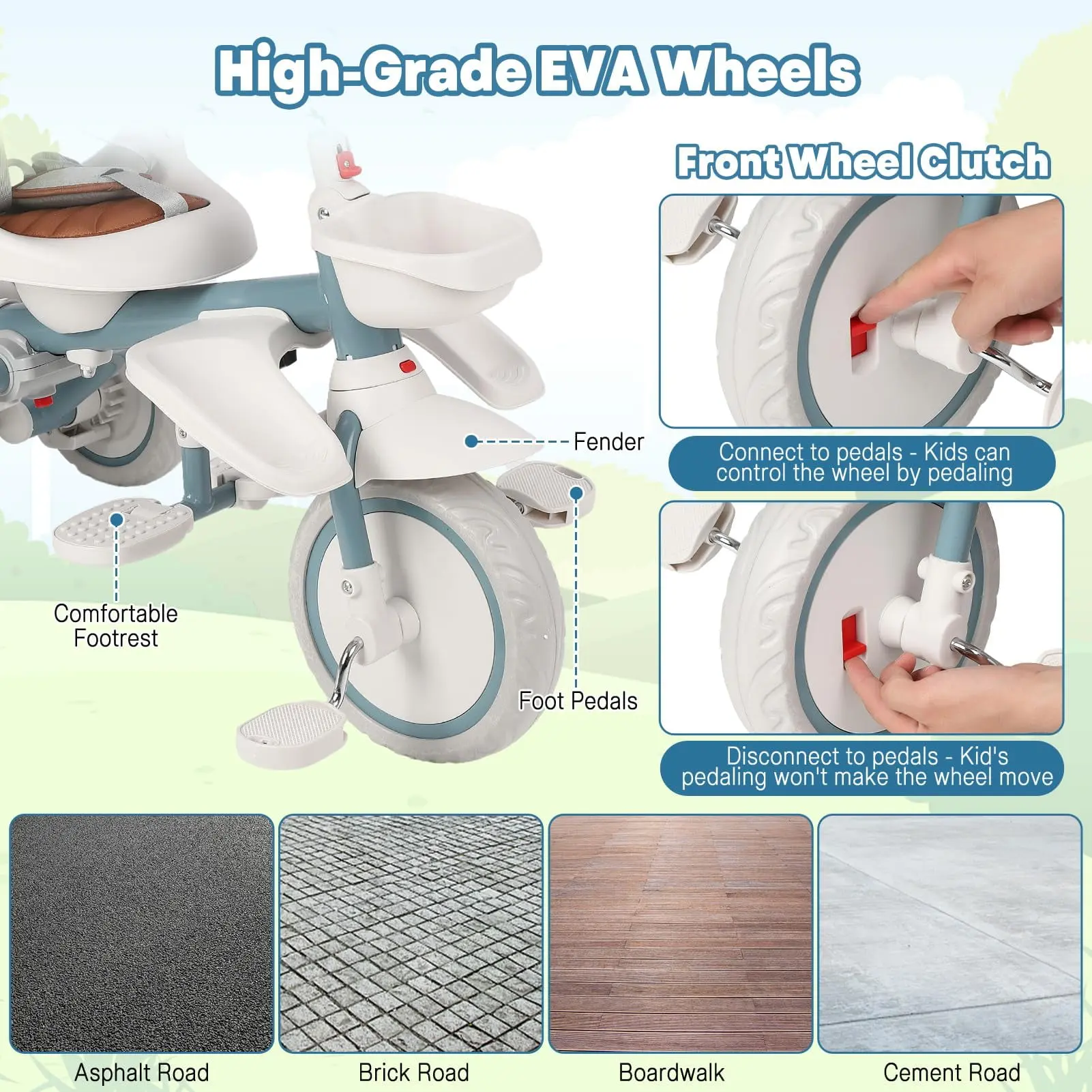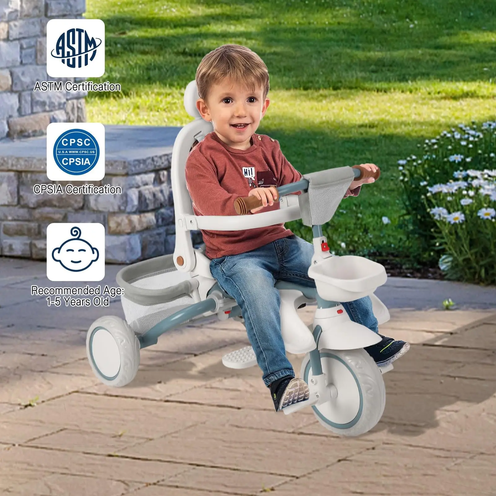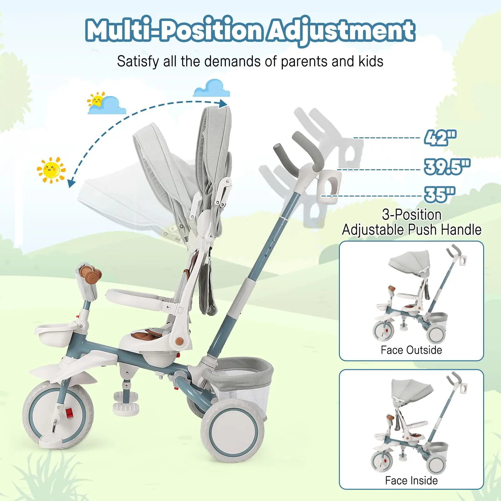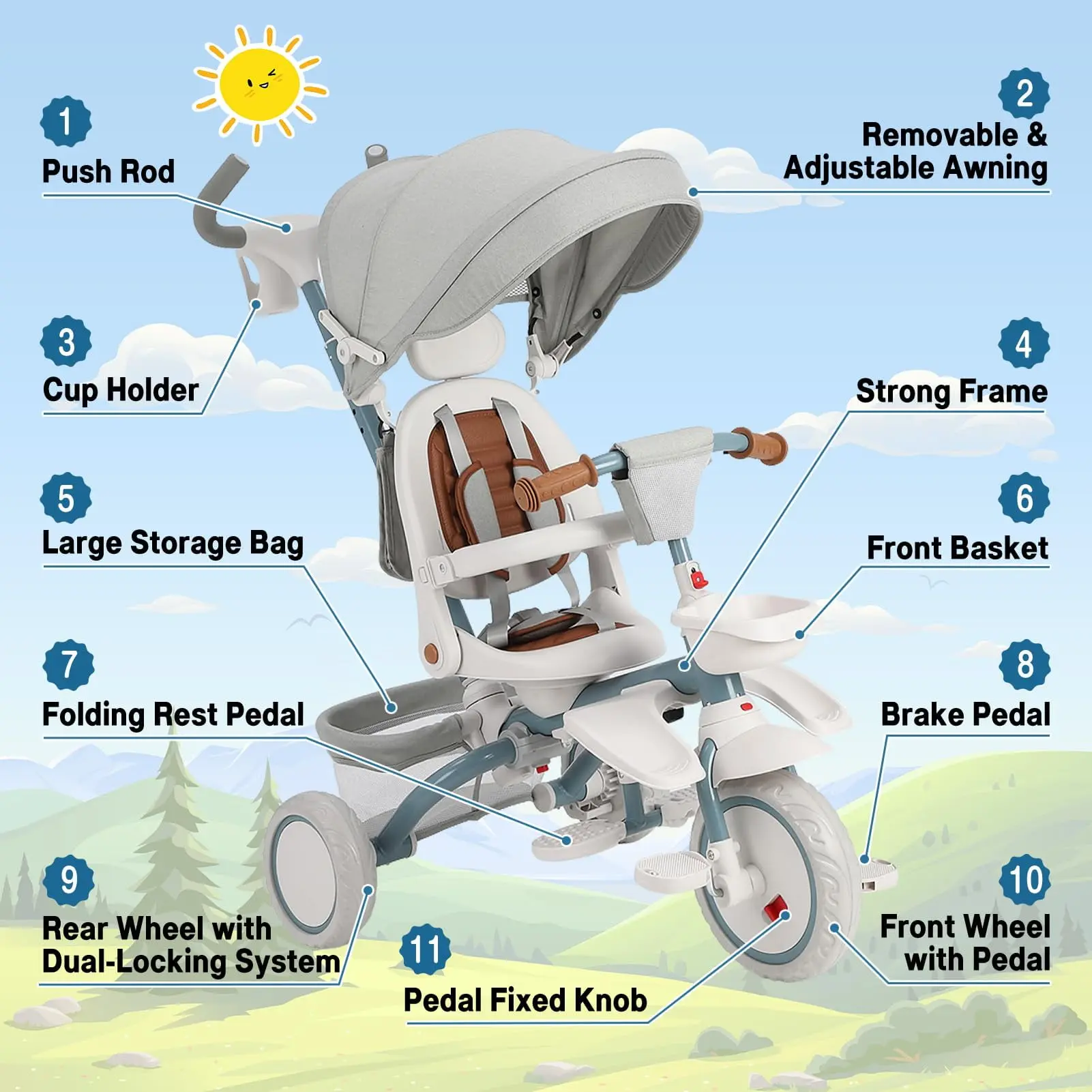 The GloryStar 7-in-1 Baby Tricycle is the ultimate ride for toddlers! Designed to grow with your child from ages 1 to 5, it features a folding frame, adjustable and removable push handle, safety harness, and secure brake for peace of mind. The rotatable seat, adjustable canopy, storage basket, and cup holder provide maximum comfort and convenience. Transform it easily from stroller to trike as your little one grows—perfect for family outings and everyday adventures!
