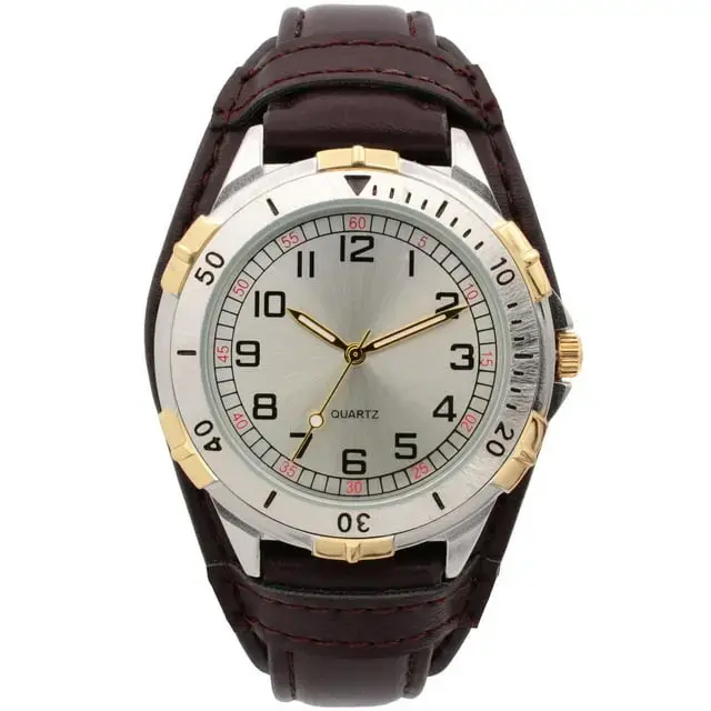 Brown PU leather strap ● Gold hands ● Quartz Movement ● Stainless Steel Case Back ● Case: 42mm ● Strap (including case): 260 mm