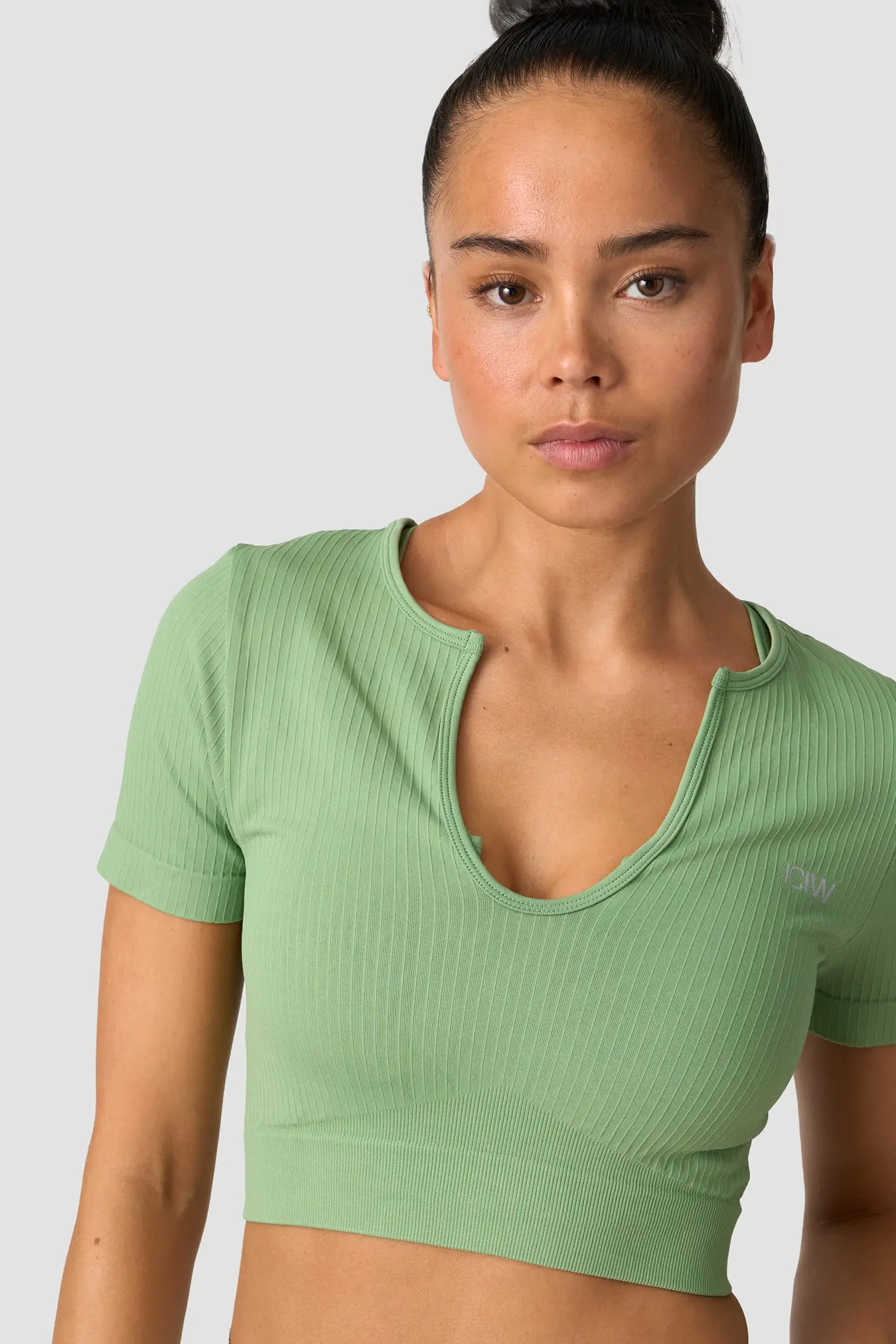 Cropped seamless T-shirt with V-neck. You asked, we delivered. Our most popular collection, Define Seamless is now here as a ribbed version. The seamless material is soft, stretchy and pliable, resulting in a garment with great movability and fit. Tights, sports bras and tops in several trendy colors makes the Define Seamless the go to line of workout clothes for a lot of different types of training. 4-way stretch material in the latest seamless technology to increase mobility during your workout. Stretchy and durable material. ICIW logo. SWEATTECH™. Flattering v-shaped neck. 92% Recycled Nylon, 8% Elastan