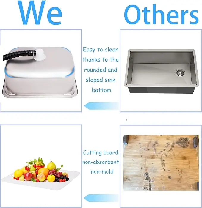 【Premium Quality】outdoor kitchen sink with Premium 305 Stainless Steel, anti-corrosion and anti-rust, durable easy clean. cutting board is made of polypropylene plastic, non absorbent, not moldy. It is gentle on knives, keeping their blades from getting dull quicker