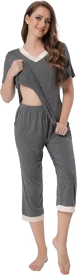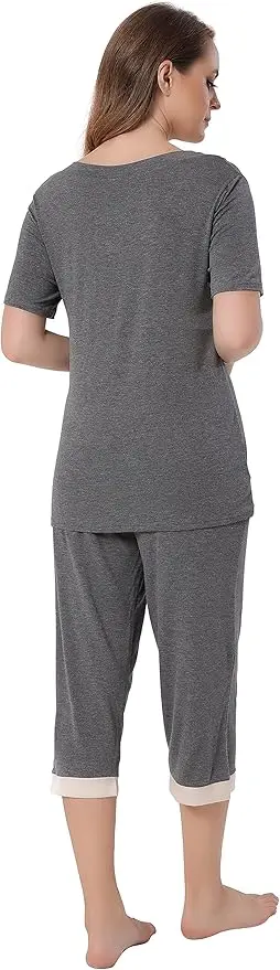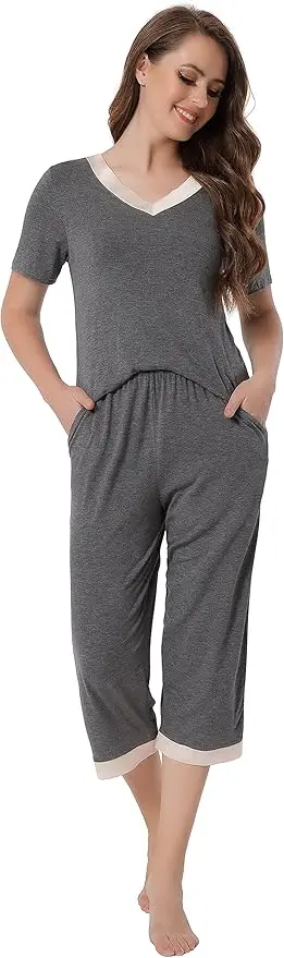 Short sleeve low v-neck top with satin neckline trim, stylish design makes you look more attractive. Capri pants with elastic waistband and two pockets at sides.