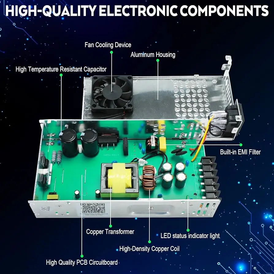 【Effective Cooling System】The switch power supply is equipped with an internal cooling fan and a heat sink design, and the housing is designed with multiple ventilation holes, significantly improving the heat dissipation efficiency. This effectively prevents the circuit board from overheating and damaging, ensuring stable and efficient operation of the equipment and extending the lifespan of the power supply.