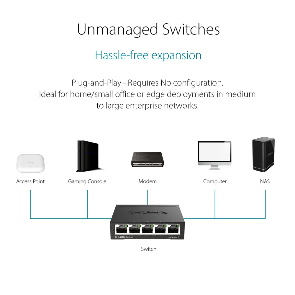 The D-Link DGS-105 is a silent, metal-cased 5-port Gigabit Ethernet switch that adds instant, lag-free wired connectivity to any home, office, or creator workspace. With a 10 Gbps switching fabric, QoS traffic prioritization, and Green Ethernet power savings, it supports a wide range of applications, from 4K streaming and online gaming to VoIP phones and smart home hubs—no configuration required. Desktop or wall-mount, the fan-free design helps with staying cool and quiet for years, backed by D-Link’s Limited Lifetime Warranty and North American-based support.