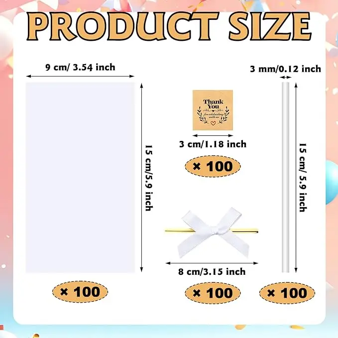 - Ideal Size: we offer the ideal sized clear rice krispie treat bags, staying true to the ideal measurements of 9 x 15 cm/ 3.54 x 5.9 inches, the white sticks measure about 15 cm x 3 mm/ 5.9 x 0.12 inches, charming white bow ribbons are about 8 cm/ 3.15inches in length and Thank you stickers are about 3 cm/ 1.18 inches in diameter