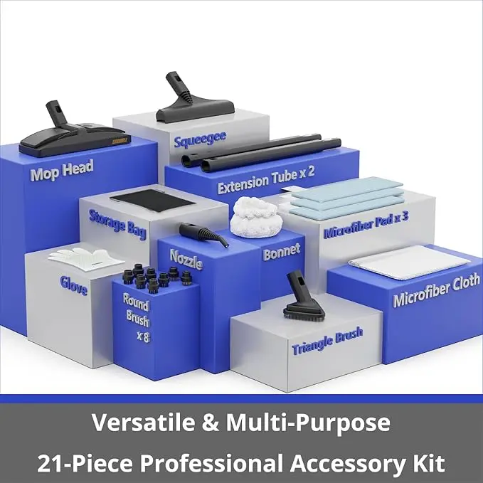 - [Versatility]: Handheld steamer comes with 21 basic accessories, allowing for easy and eco-friendly completion of cleaning tasks. It can be used on various surfaces, from hard floors and glass to furniture and even clothing. They are designed to handle hard-to-reach areas and can be used to clean everything from interior decorations to kitchen utensils