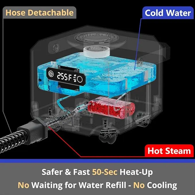 - [2024 Steam Cleaner New Design Features]: Produces steam in just 50 seconds, reaching temperatures of 230°F-260°F (110°C-126°C). It offers both dry and wet modes, and you can add water at any time during operation without closing the water tank lid, with no waiting required. The dimensions are 9.2" x 9.2" x 8.4", and it comes with a 7.2-foot (2.2-meter) extended hose and a 0.6-gallon (2.2-liter) water tank