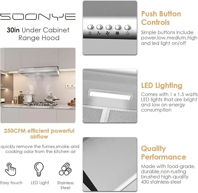 Soonye 30" Stainless Steel Under Cabinet Range Hood
