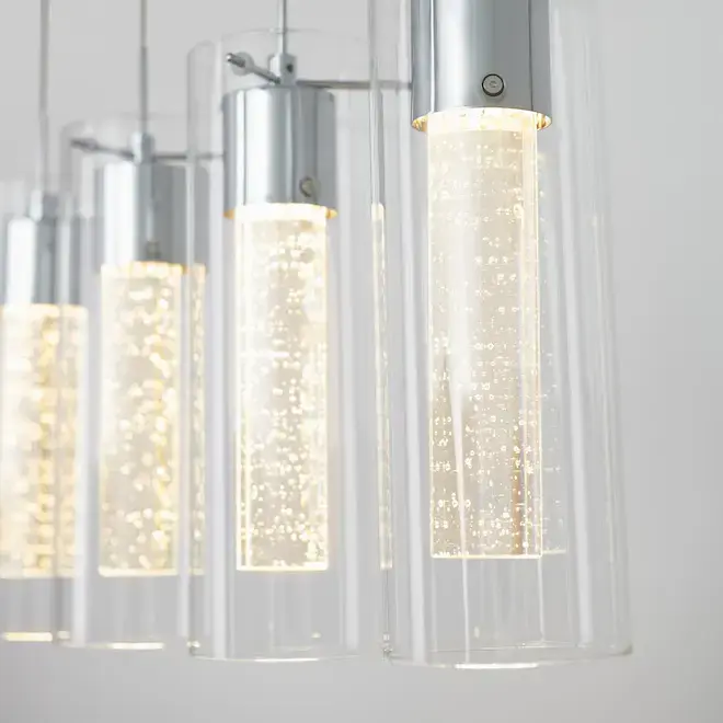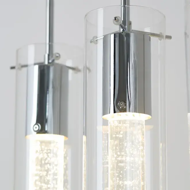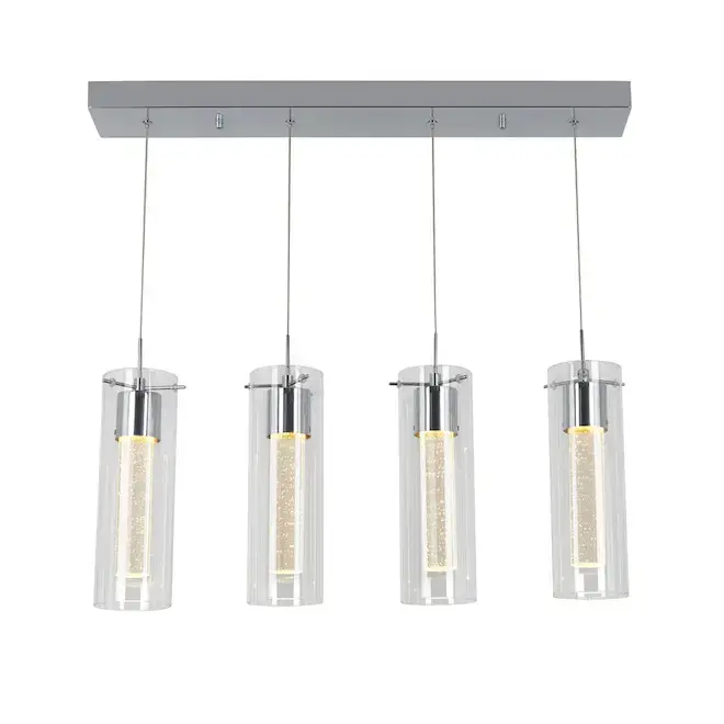 Shine a bright glow on your living space with this 4-light pendant light. It combines a sleek, modern design with energy-efficient capabilities, and it's ideal for lighting up a kitchen, dining room, or an entry way. It works with halogen or LED bulbs (GU10/35 W/120 V), which are available separately, providing multiple illumination options. The premium crystal glass shades hang from adjustable wires to a length of up to 1.8 m, and they attach to an easily installed chrome-finished metal fixture. This pendant light comes with installation hardware for immediate hanging.