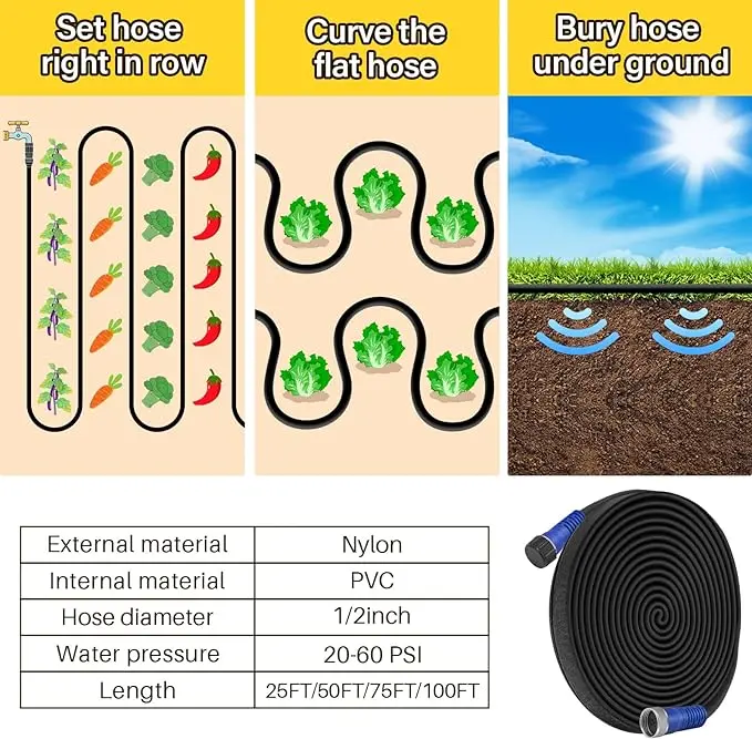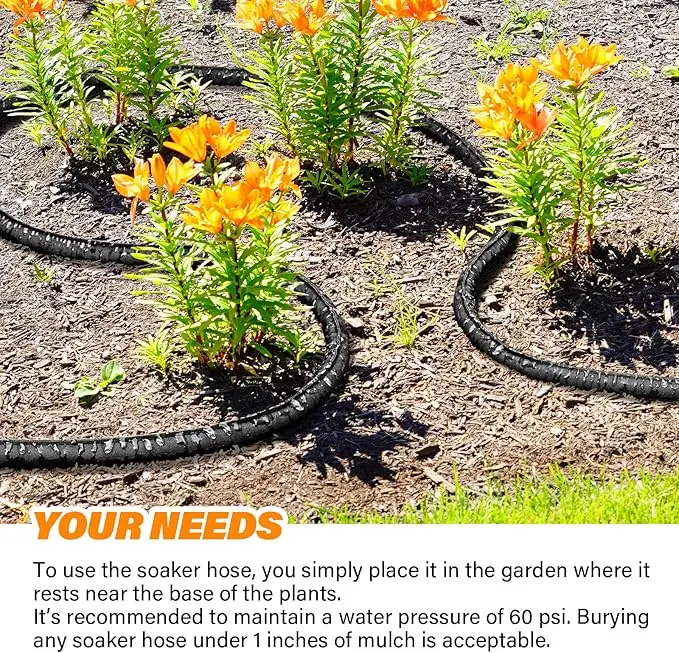 Save 80% Water and Time: The kink-free garden soaker hose delivers water efficiently to plant roots and soil, minimizing evaporation and saving up to 80% water; It also drastically cuts down your watering tim; Whether placed above ground or hidden under foliage, this hose performs efficiently as long as water pressure stays below 60 PSI