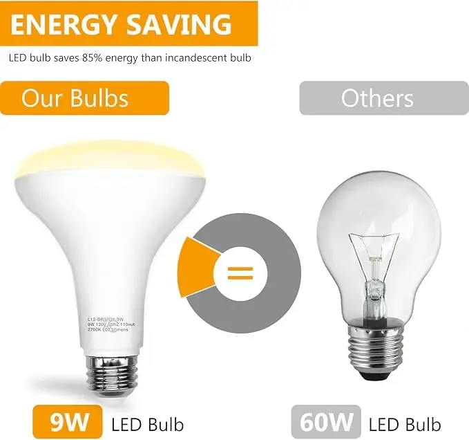 - Energy Saving & Long Life Span: Different from traditional 60W incandescent bulbs, the 9W BR30 LED lights bulbs are 65W equivalent and change to energy-efficient lighting, which is reduce energy consumption