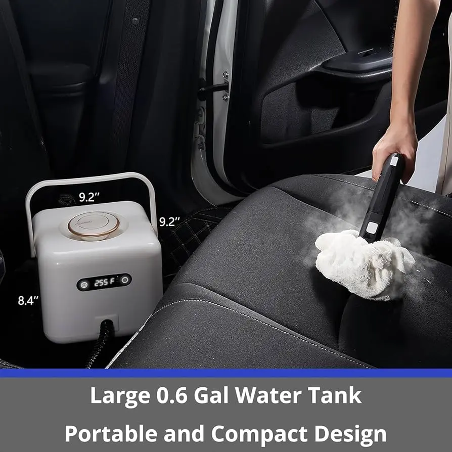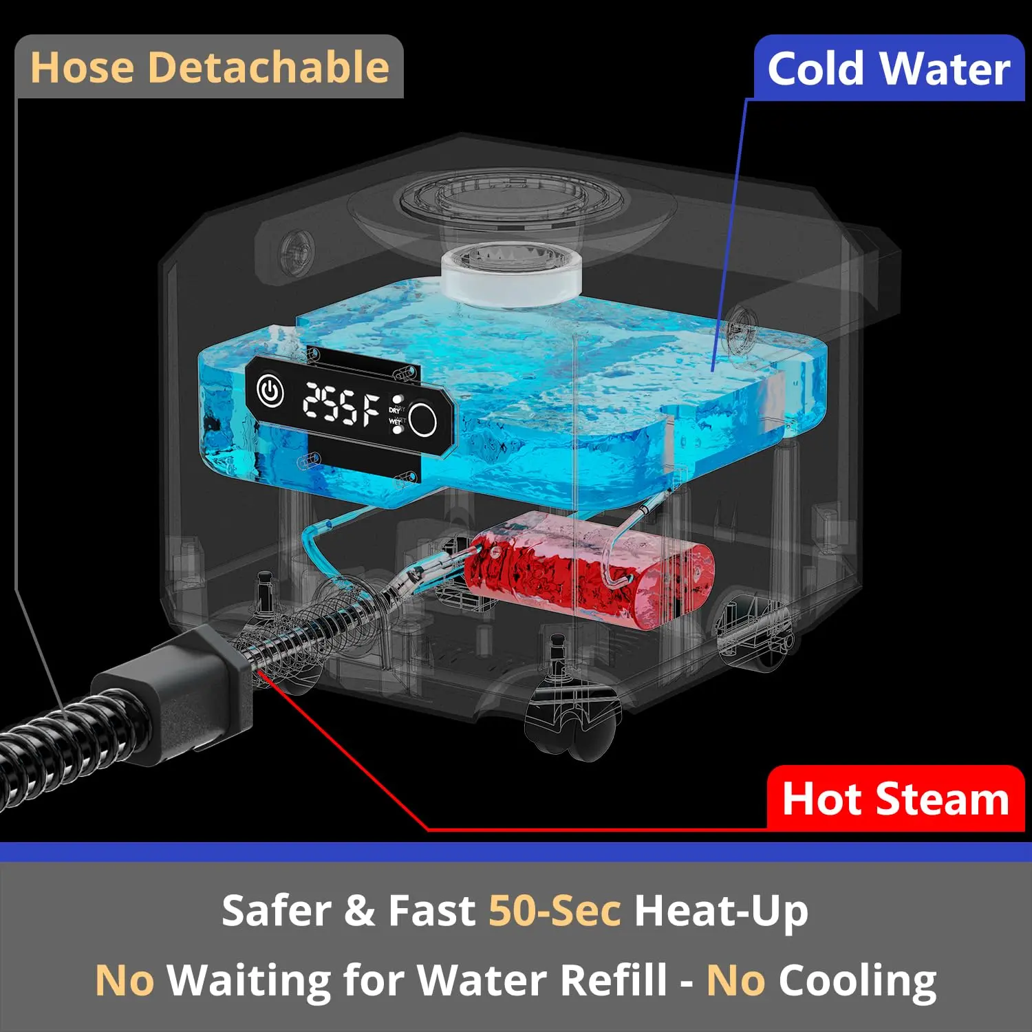 [Quick-To Use]Produces steam in just 50 seconds, reaching temperatures of 230°F-260°F (110°C-126°C). It offers both dry and wet modes, and you can add water at any time during operation without closing the water tank lid, with no waiting required. The dimensions are 9.2" x 9.2" x 8.4", and it comes with a 7.2-foot (2.2-meter) extended hose and a 0.6-gallon (2.2-liter) water tank