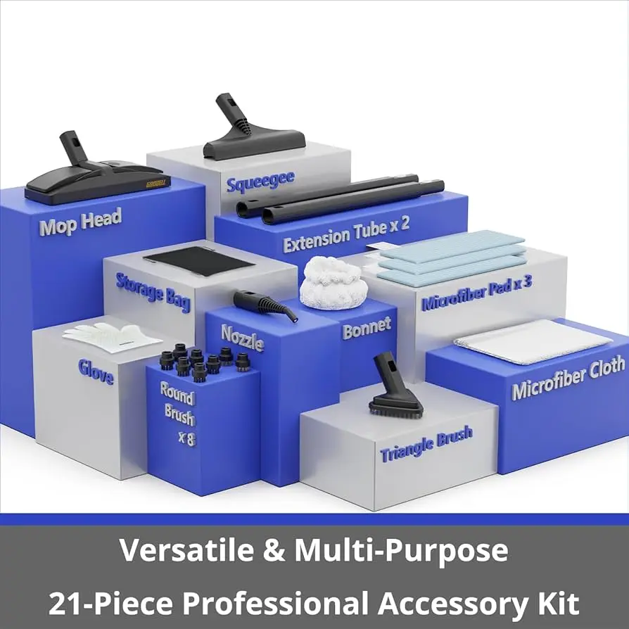 [Versatility]: Handheld steamer comes with 21 basic accessories, allowing for easy and eco-friendly completion of cleaning tasks. It can be used on various surfaces, from hard floors and glass to furniture and even clothing. They are designed to handle hard-to-reach areas and can be used to clean everything from interior decorations to kitchen utensils