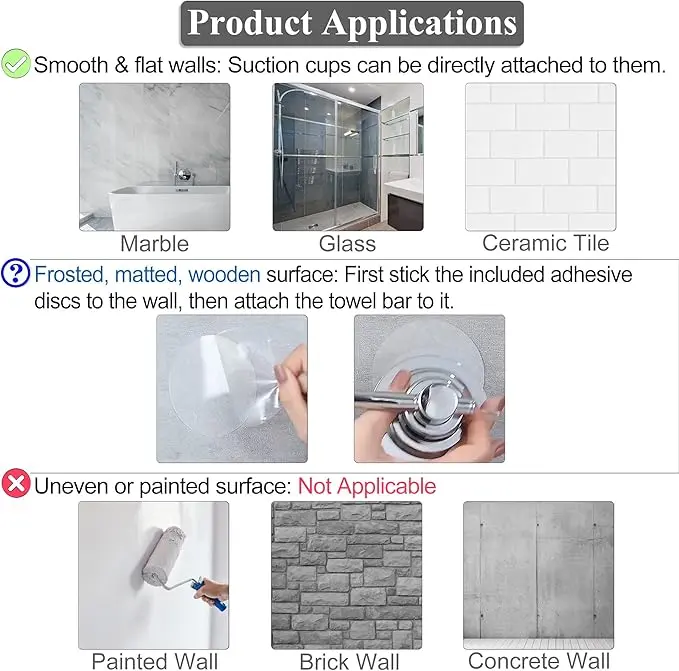- NOTE---Not for Rough and uneven or painted surface!!! Only for smooth surface (glass, marble, etc.), or slightly rough surface (Such as wood door, frosted wall. There are adhesive discs in the package to make the surface smooth).