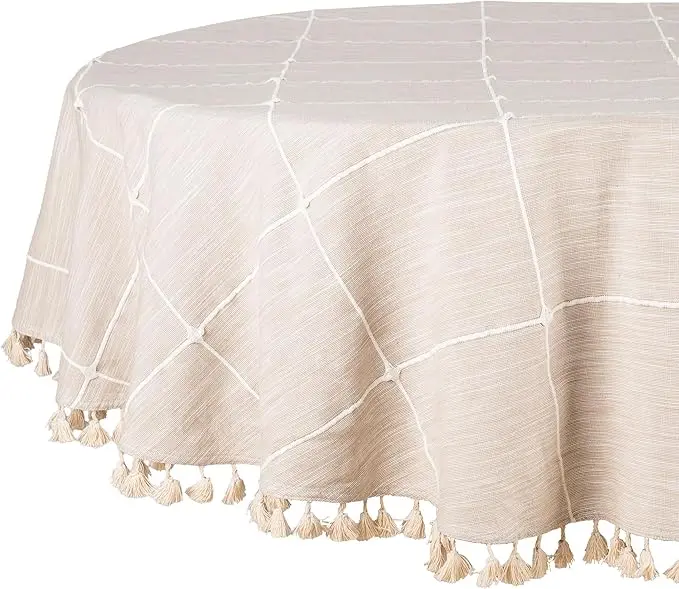 - Round Table cloth: This beige round cotton tablecloth is weaved with cotton fabric, making it easy for regular use. This plaid tablecloth is Round 63 inch. We have made the farmhouse round tablecloth that will perfectly suit a boho round tablecloth that can accommodate 4-5 people.