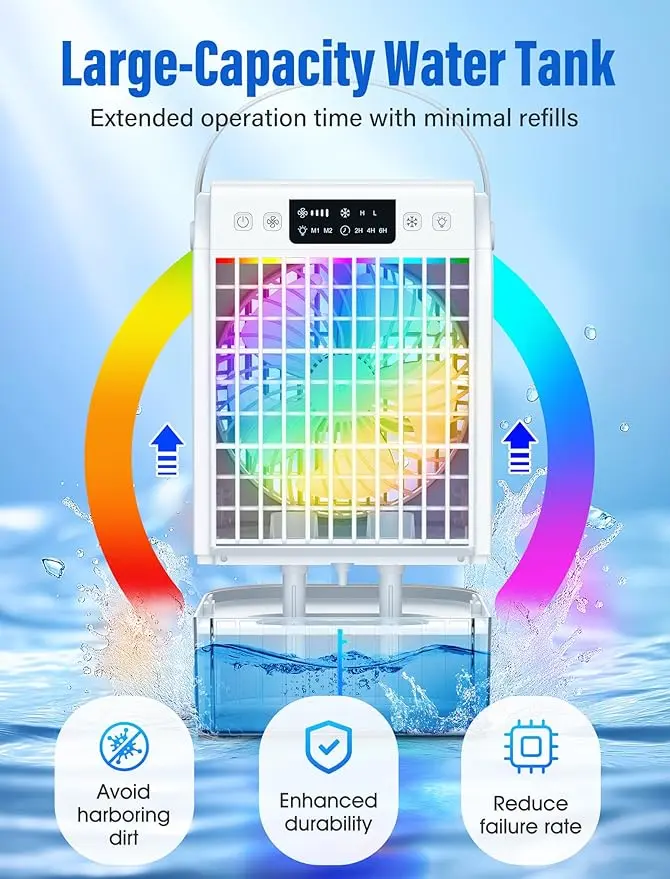 - 【Instant Heat Relief】Beat the heat instantly—whether working in your home office, relaxing in a compact bedroom, or enduring a long car commute. The 1500mL high-capacity tank and adjustable fan deliver rapid cooling, while the 7-color ambient lighting enhances relaxation. Compact and lightweight, it’s perfect for small spaces where traditional ACs can’t reach, transitioning effortlessly from indoor to on-the-go use.